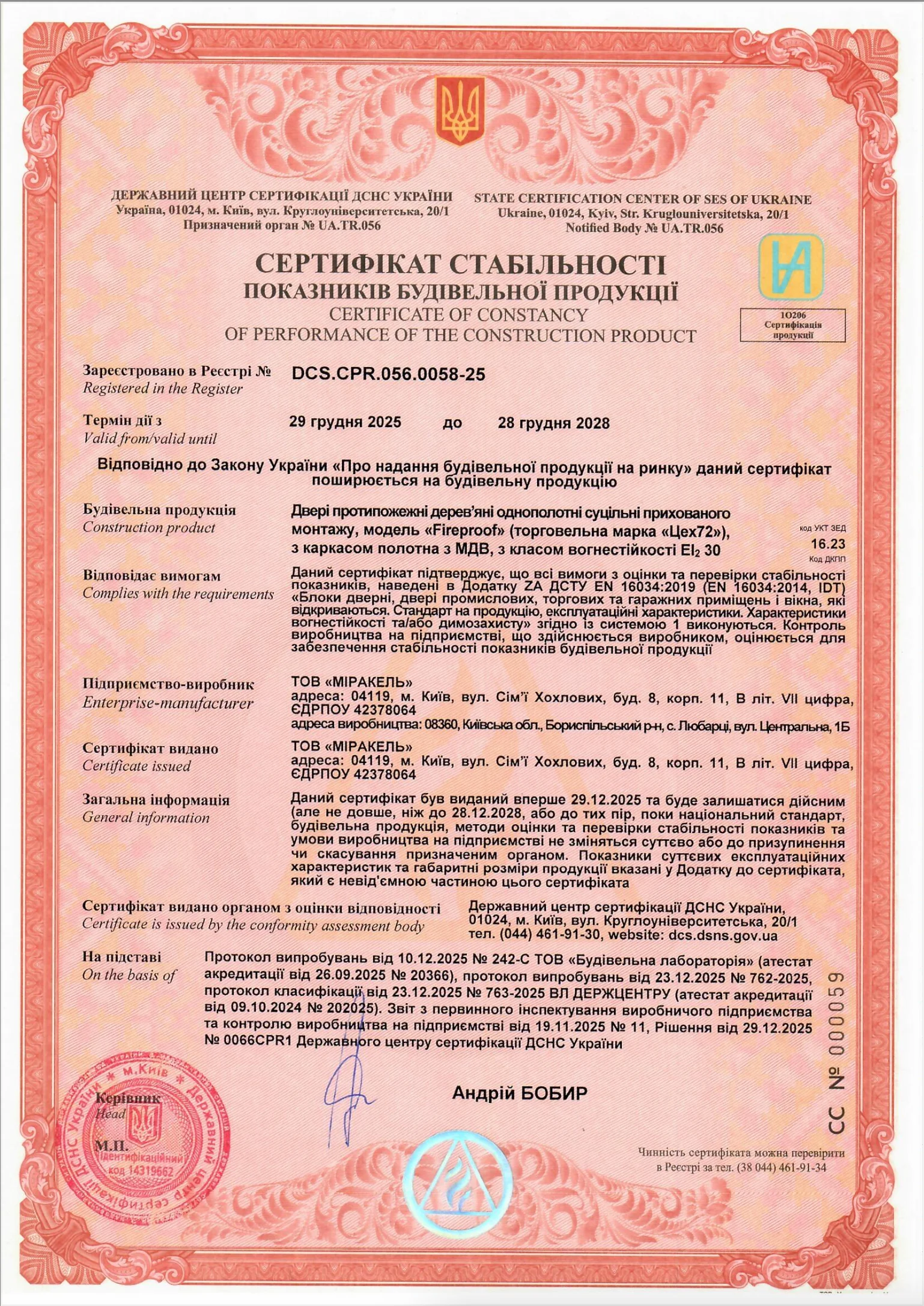 Сертификат соответствия противопожарных дверей требованиям огнестойкости (класс EI 30)